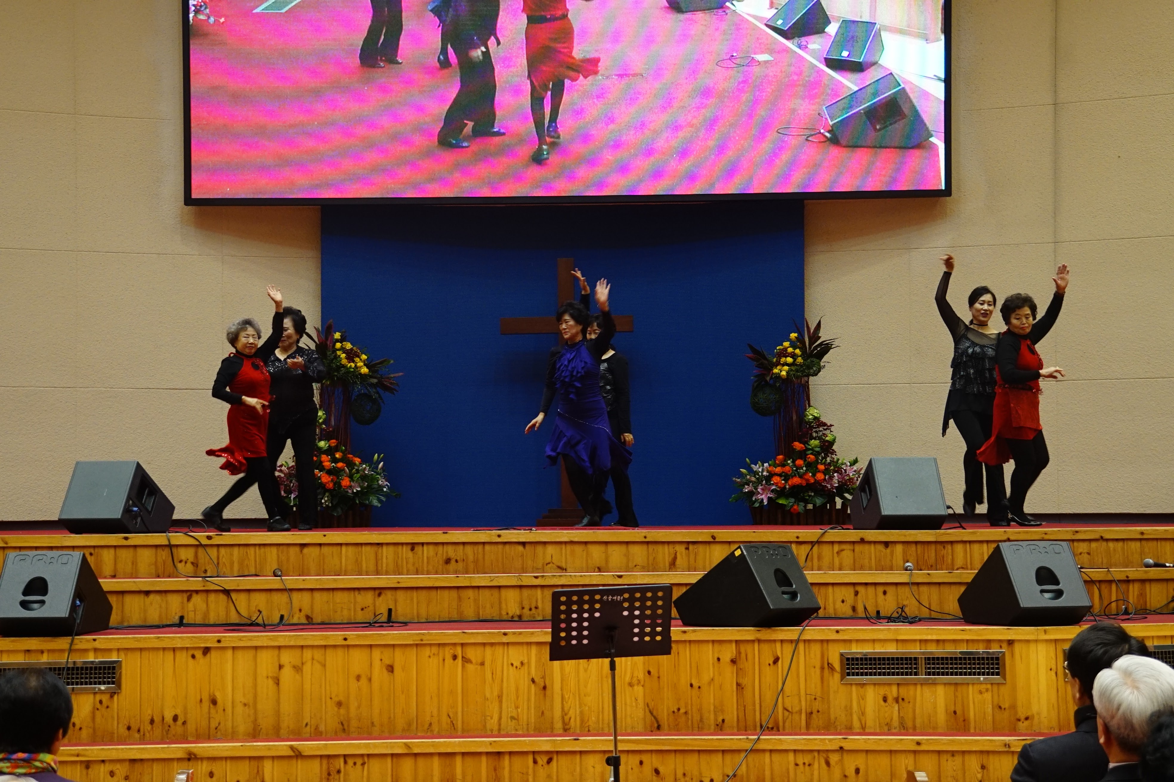 한빛실버대학에서 2015학년도를 마감하면서 한 해 동안 갈고 닦은 실력을 발표하는 무대가 12월 2일 수요 저녁 예배 시간에 있었습니다. 이번에 선보인 과목은 고전 무용, 댄스 스포츠, 합창입니다.