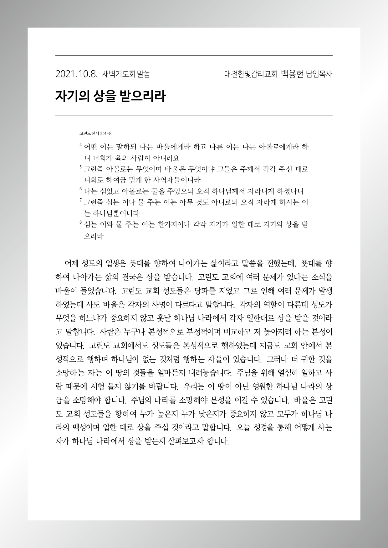 고린도전서 3장 4-8절